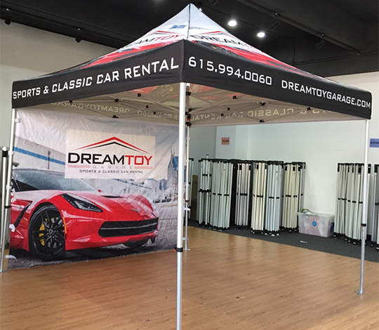 A custom sales tent is the perfect place to show off your customers’ perfect vehicle.  Our custom vehicle sales and rental tents can be used for so many different things!  Advertise a sale weekend or event, go out into your local community, put it up at a local car, truck or motorcycle show.  Really the possiblities are endless.  Have a custom rental car business?  Great for that too!  Use a bright, colorful tent to attract your customers to the best the market has to offer.  Branded with your logo, maybe a photo or 5, and your contact info will be easily accesible to hundreds of people at one time.  Not to mention its a great place to have a conversation in comfort and shelter from the elements.