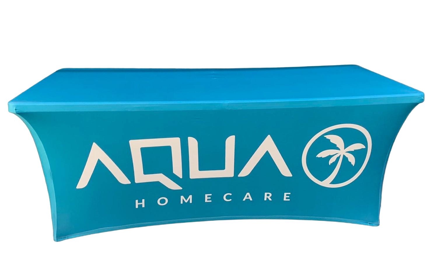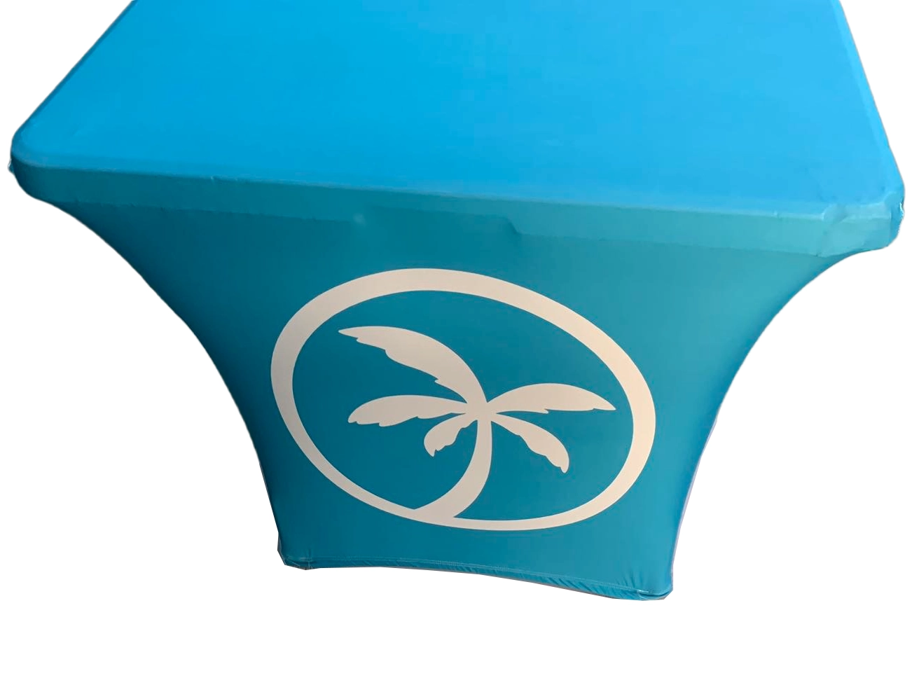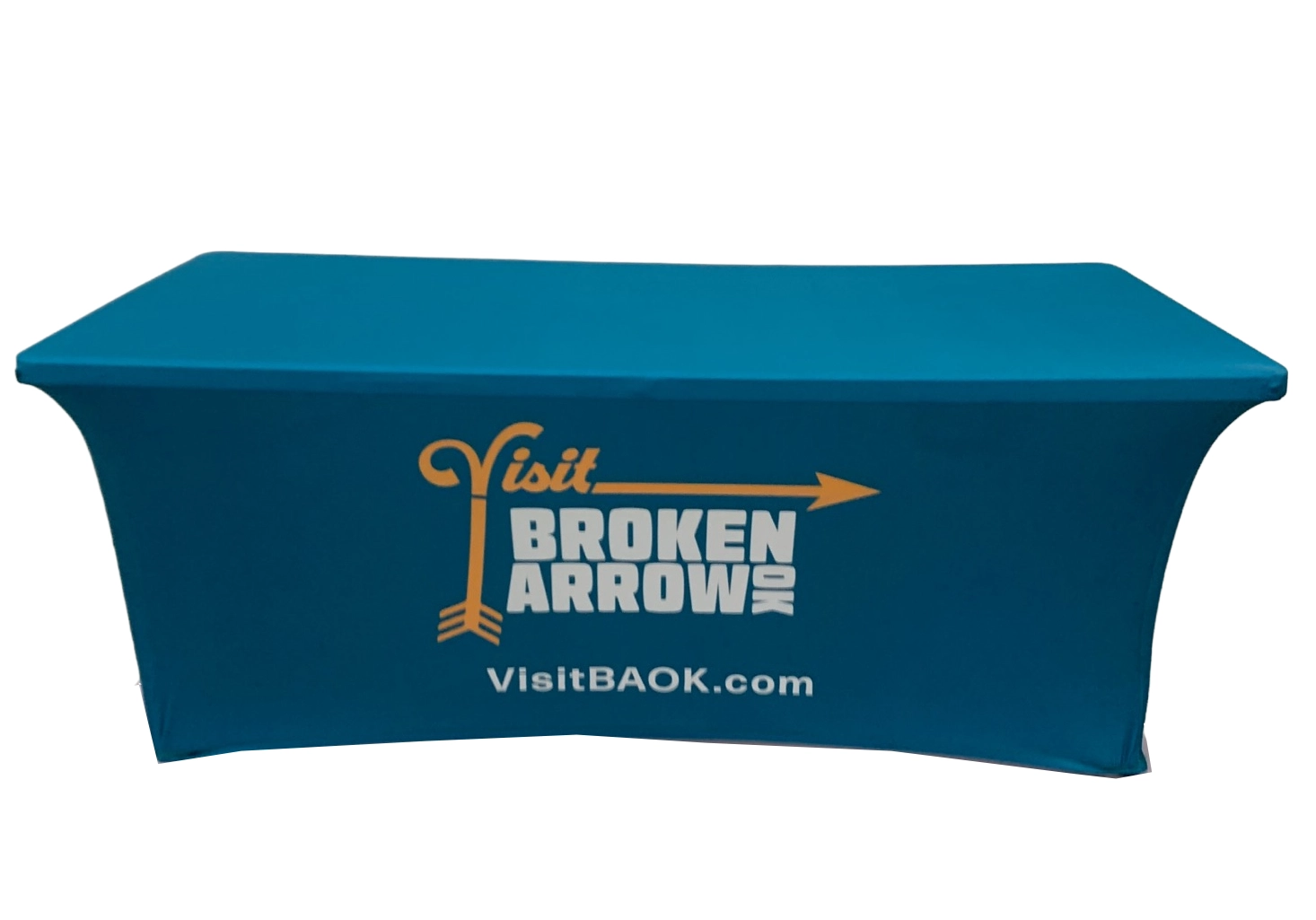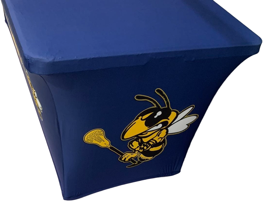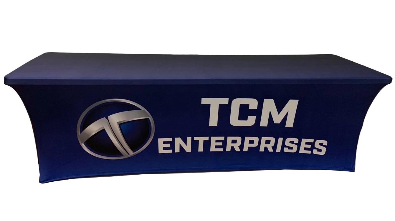 Our custom table covers are made from 180 gram polyester and come in 6 and 8 foot versions and can be 3 sided or 4 sided.  We tell people if you are using your table cover in the summer, outside, then maybe the 3 sided version would be perfect.  If you want to hide stuff under your table, no problem, get that 4 sided version.  All of our table covers are wrinkle resistent and flame retardent for safety standards.