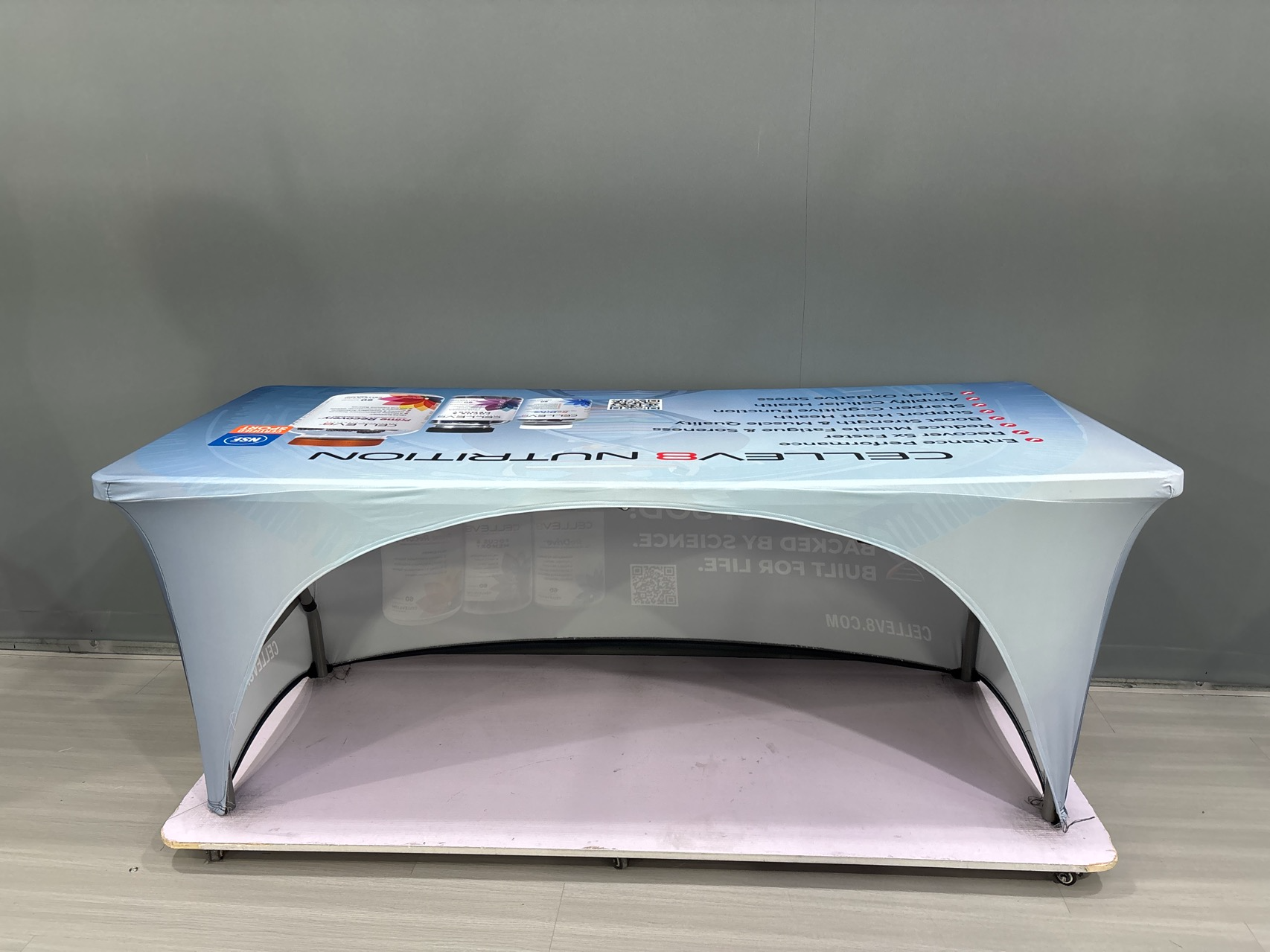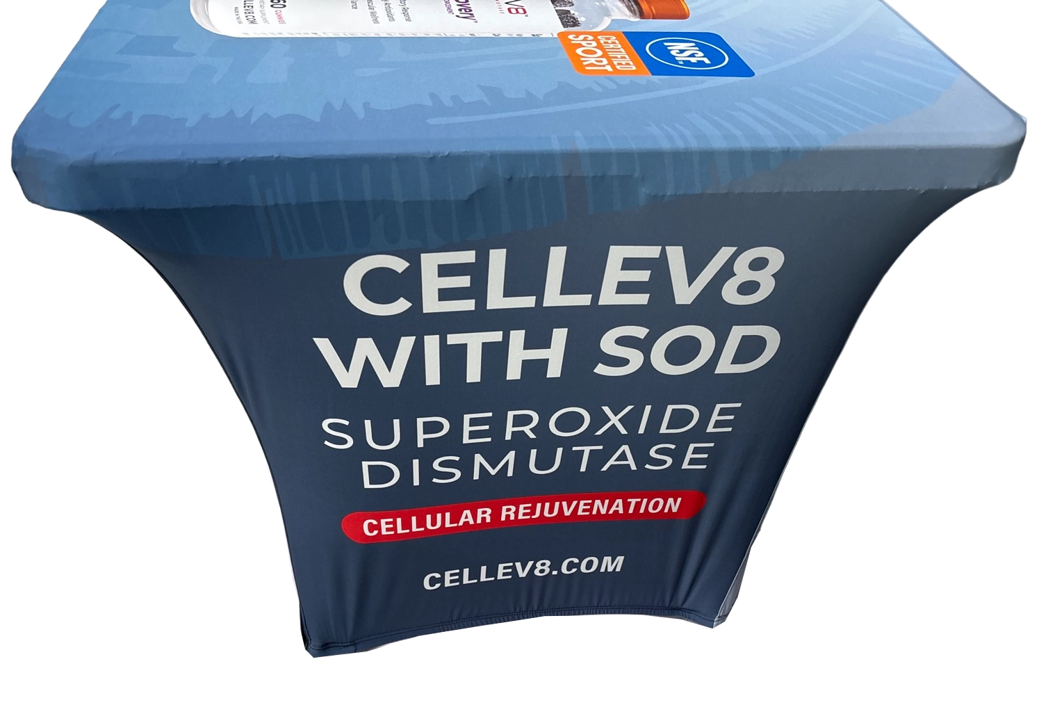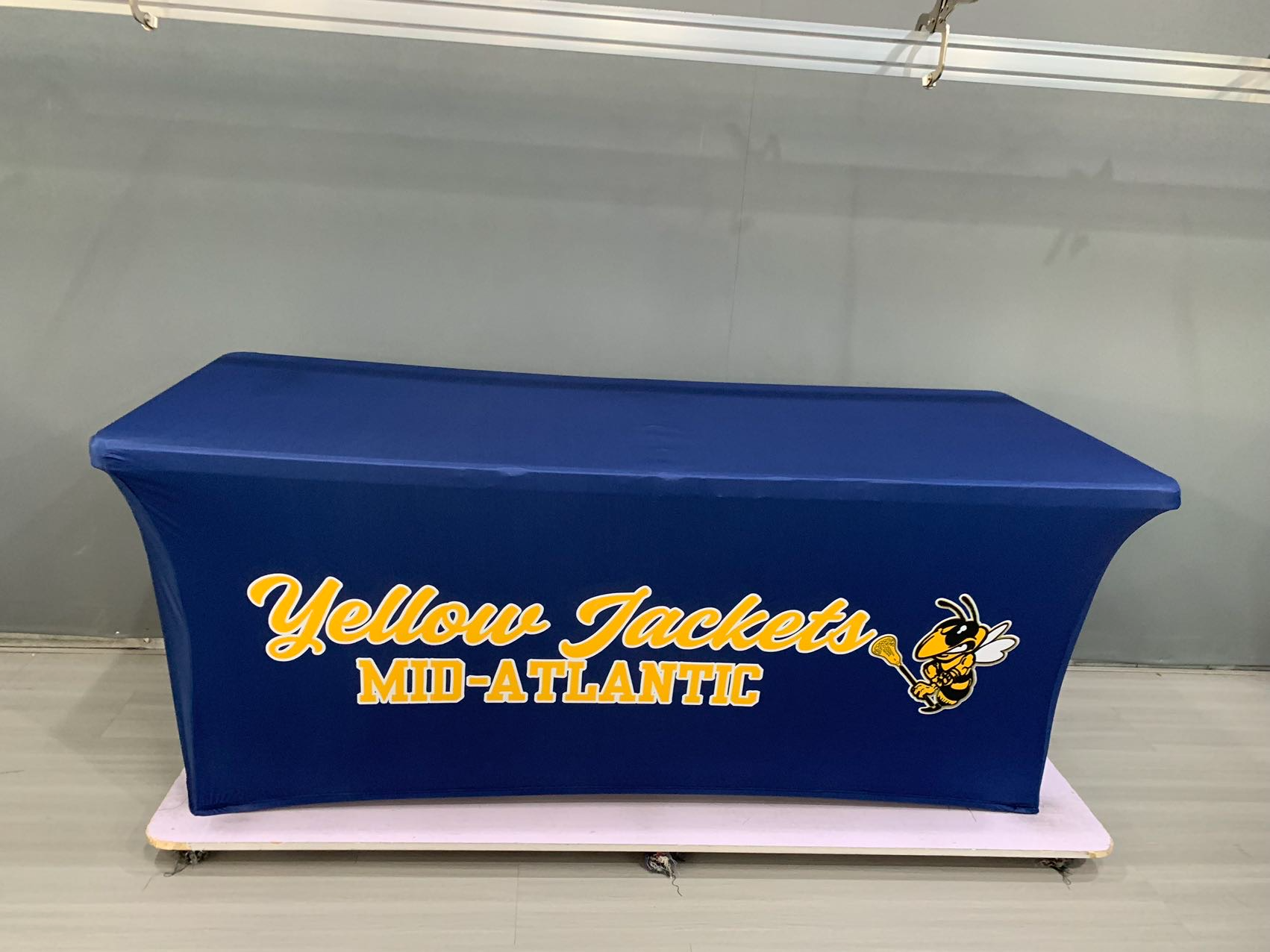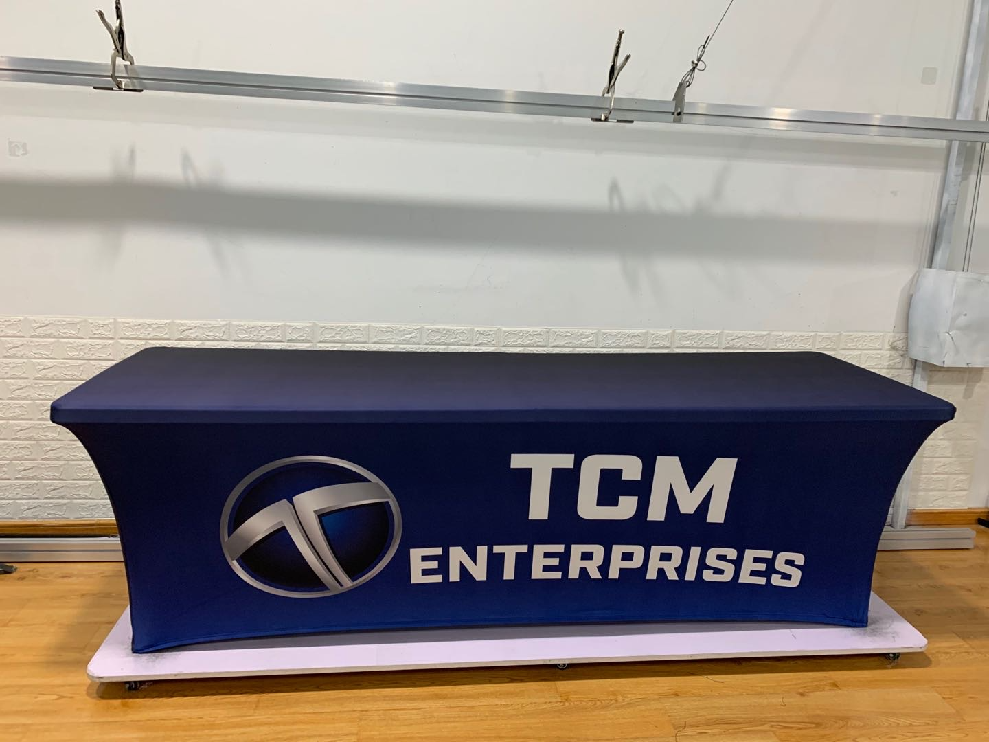 Our custom table covers are made from 180 gram polyester and come in 6 and 8 foot versions and can be 3 sided or 4 sided.  We tell people if you are using your table cover in the summer, outside, then maybe the 3 sided version would be perfect.  If you want to hide stuff under your table, no problem, get that 4 sided version.  All of our table covers are wrinkle resistent and flame retardent for safety standards.