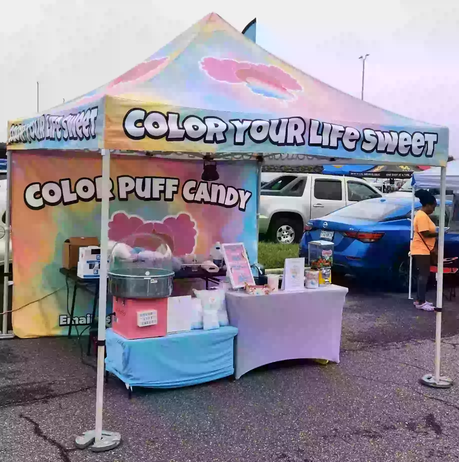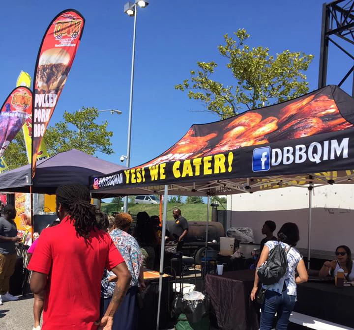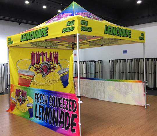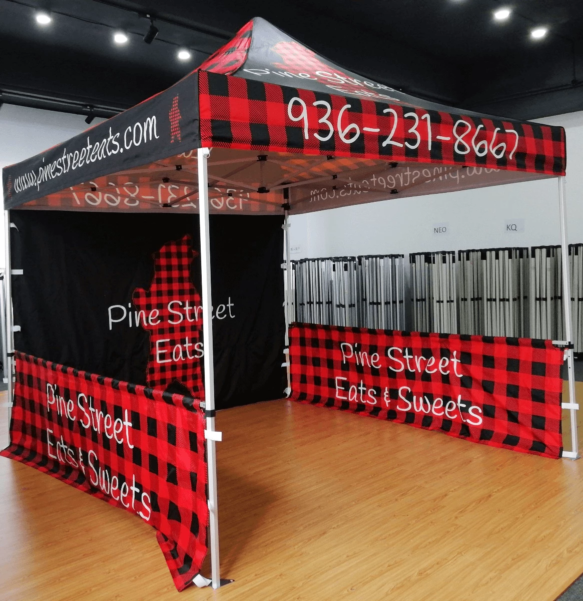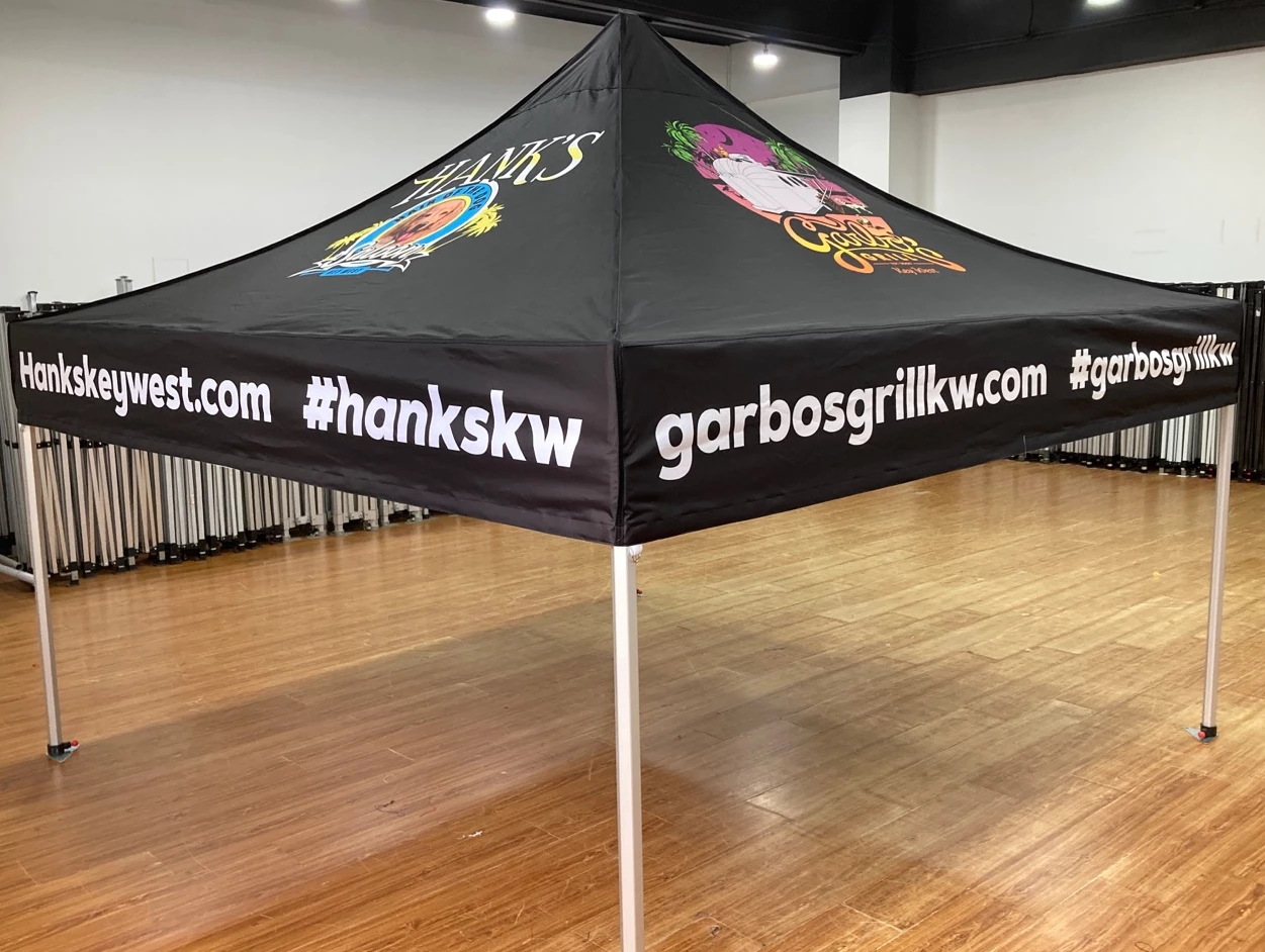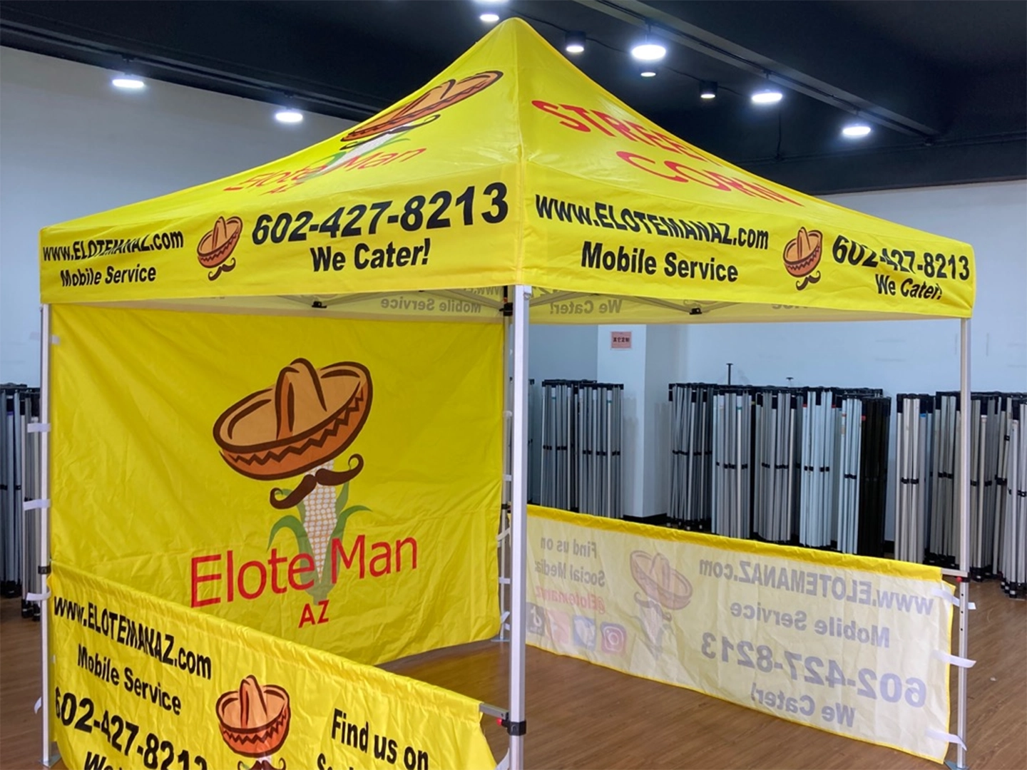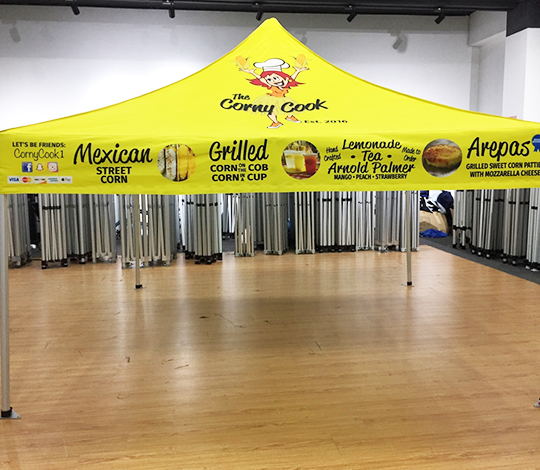 Ready for the next food event or fair? Instantly attract a line of new – and old – customers by having a completely branded and custom food vendor backdrop tent. Perfect for serving everything from lemonade to BBQ and beyond. Stand out in a sea of white tents with a bright, colorful food vendor tent to attract your customers to the best the Market has to offer. Your customers will know right away that you care enought to give the best food and service and take care of them in comfort. Custom 10×10 tents are a great investment for all small business owners. Branded with your logo, your contact info will be easily accesible to hundreds of people at one time. Not to mention its a great place to have a conversation in comfort and shelter from the elements. Plus, it’s super easy to set up and transport in our rolling carry bag.