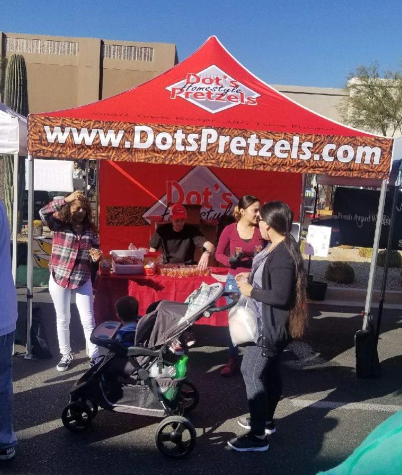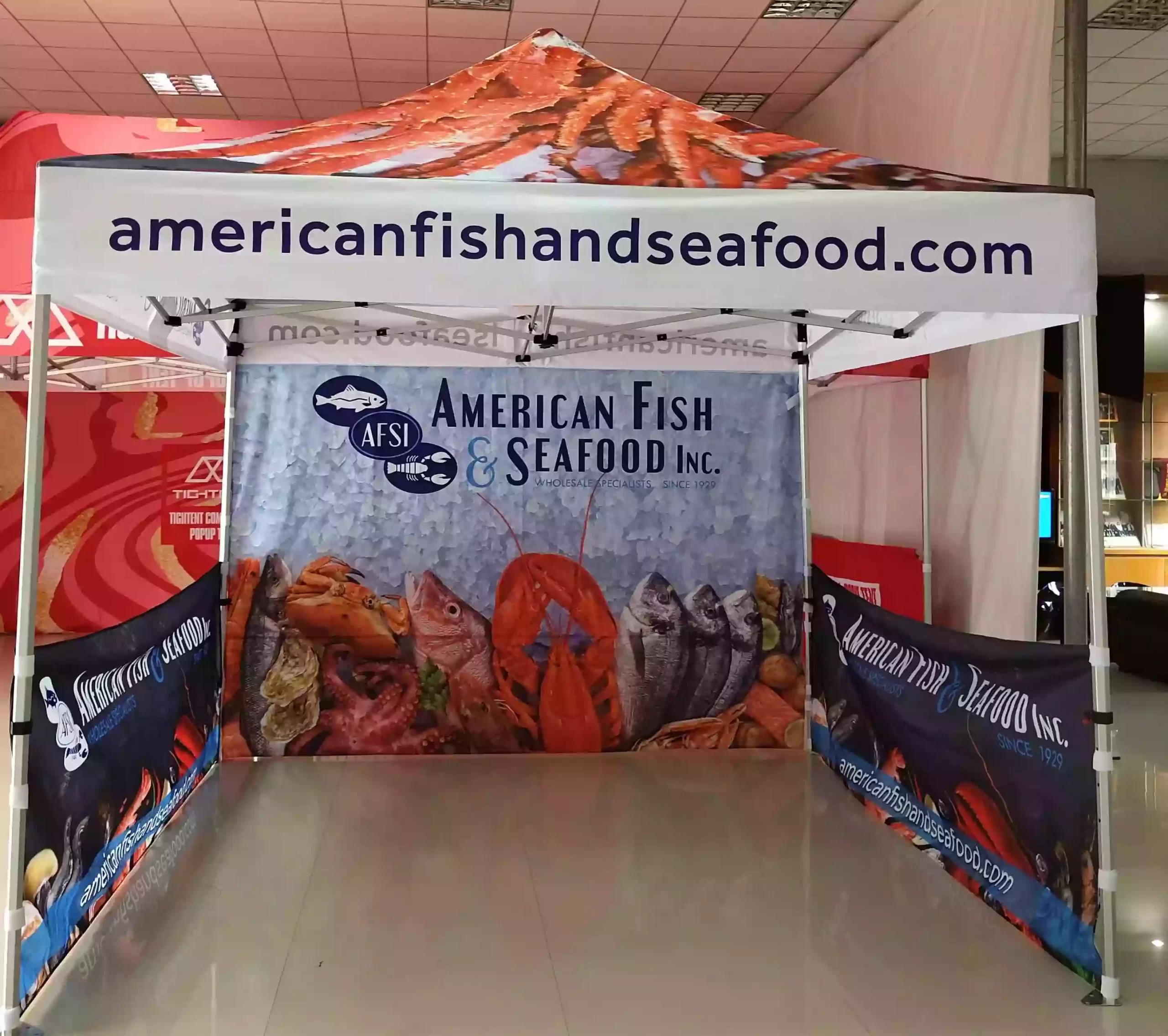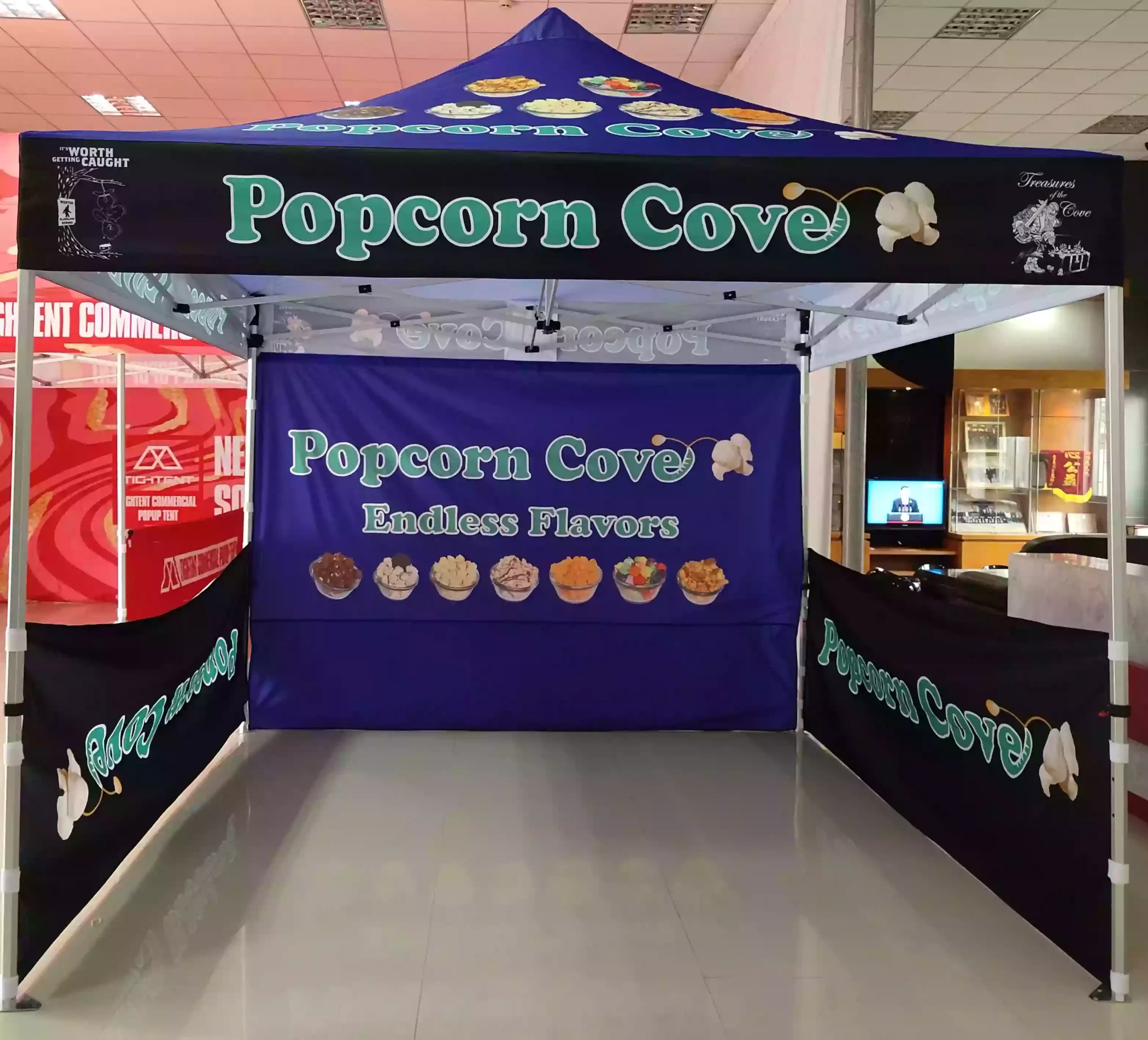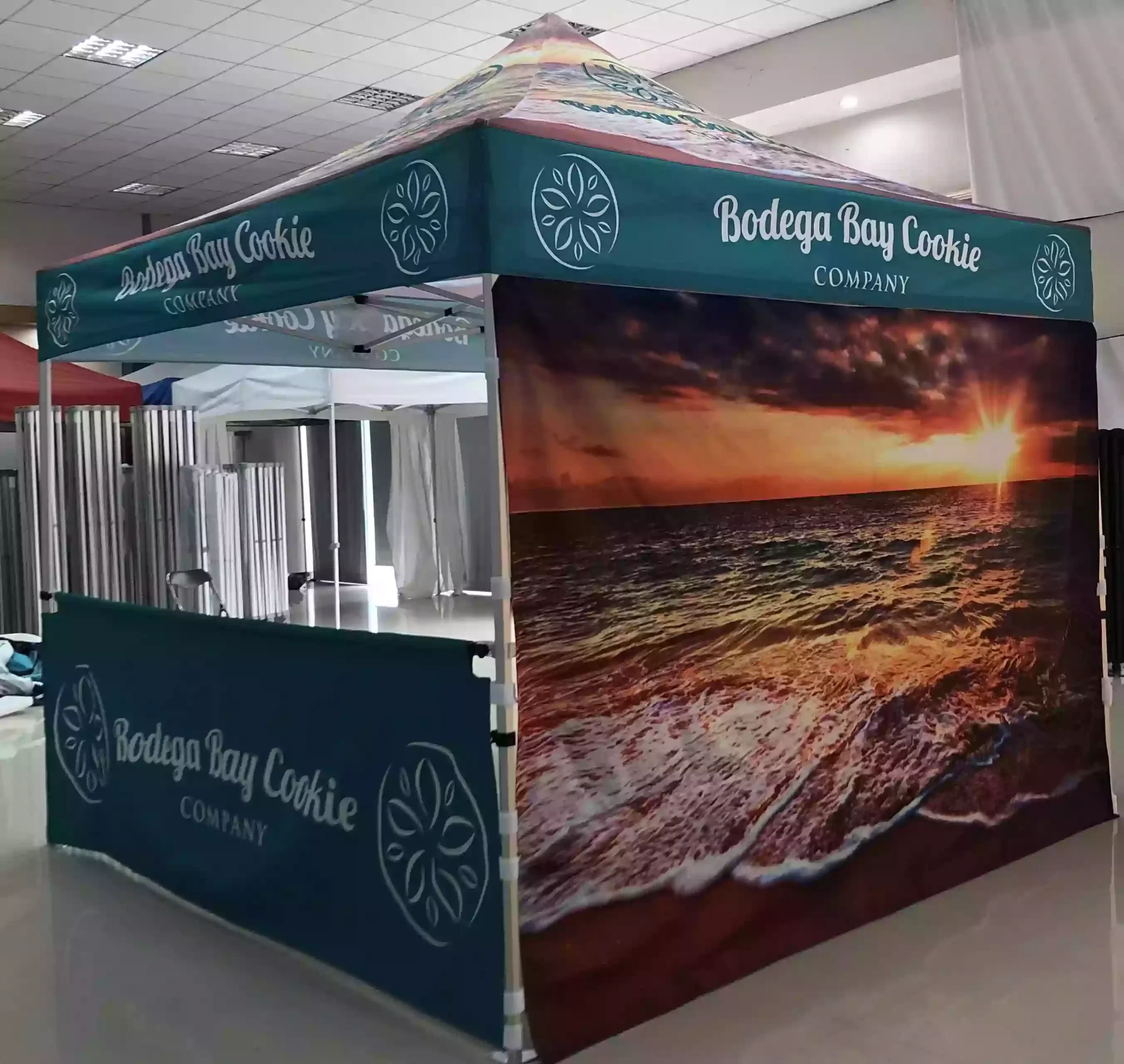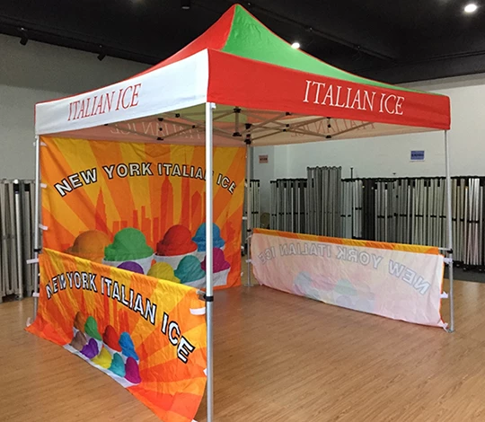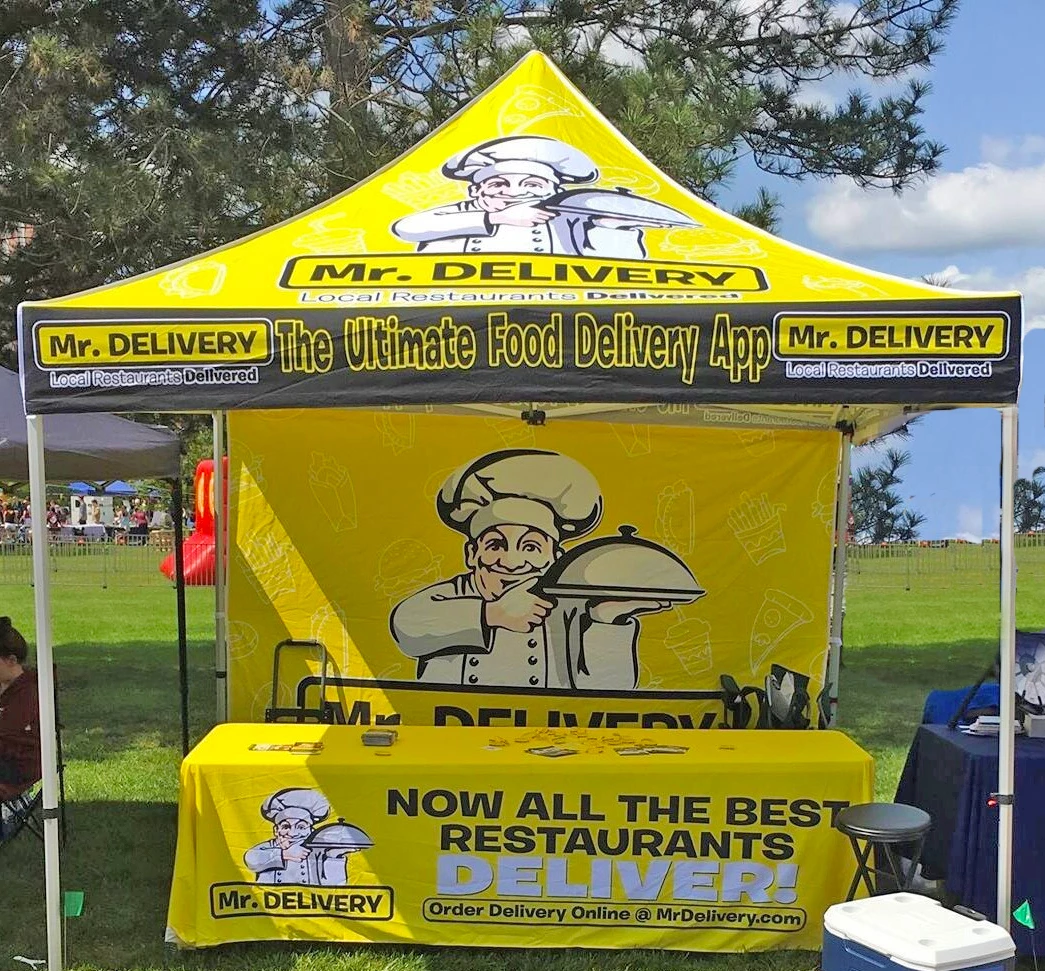 Ready for the next food event or fair? Instantly attract a line of new – and old – customers by having a completely branded and custom food vendor backdrop tent. Perfect for serving everything from lemonade to BBQ and beyond. Stand out in a sea of white tents with a bright, colorful food vendor tent to attract your customers to the best the Market has to offer. Your customers will know right away that you care enought to give the best food and service and take care of them in comfort. Custom 10×10 tents are a great investment for all small business owners. Branded with your logo, your contact info will be easily accesible to hundreds of people at one time. Not to mention its a great place to have a conversation in comfort and shelter from the elements. Plus, it’s super easy to set up and transport in our rolling carry bag.