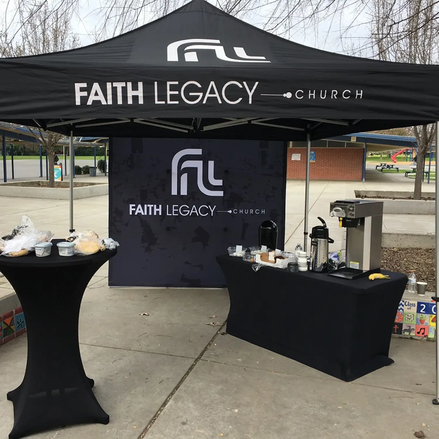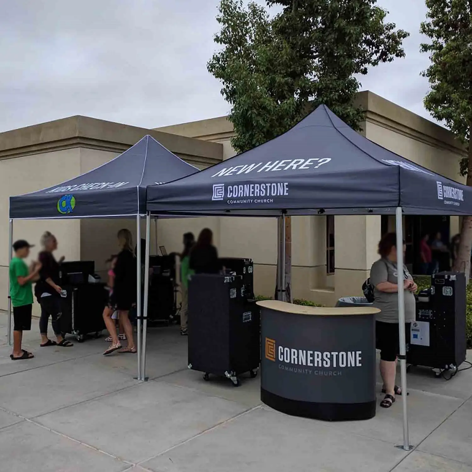 Every church was once just starting out. Like so many before you, your main goal is to welcome people and grow your church in order to spread the Word.  How welcoming would it feel for new members to walk up and be greeted in comfort of a custom tent?  So many uses would make this an investment that will more than pay for itself. Ministry work is such a essential cornerstone to our society.  Whether you are doing outreach work out in the community such as hosting a food pantry, raising awareness for a specific charity or creating a Prayer Tent, it’s such a great visible and portable representation of your church.  Want to have outdoor service?  One of our bigger 10×15 or 10×20 tents would be perfect!  Youth camps, Trunk or treat time, Vacation Bible School week and so much more. Our 10×10 tent set would be an awesome way to get your brand and mission out there.  Your can use our free design services to highlight your cause as well.  Your volunteers will have no problem finding you because you have the best and most fabulous tent in the place! Use a bright, colorful tent to attract your members.  Branded with your logo, your contact info will be easily accesible to hundreds of people at one time.