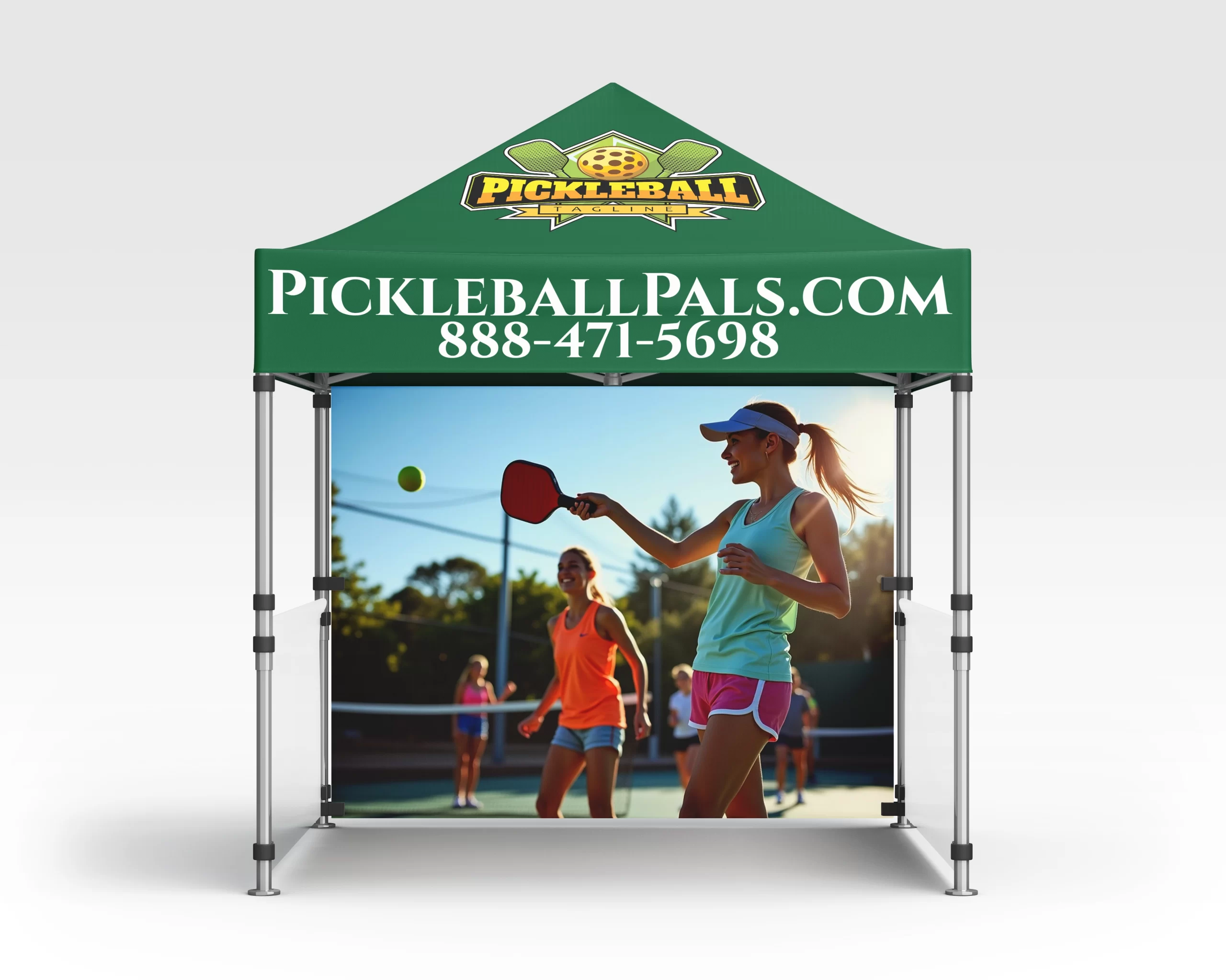 So what the heck is Pickleball? It is the hottest sport in America right now. Age is just a number when playing so it’s great for every group. That’s why you and your clubmates, teammates, partners and fellow athletes should invest in a colorful, branded custom pop-up tent. Show off your team or club is spectacular fashion and get tons of benefits in the meantime! Show up at the next tournament letting all the other teams know that you mean business. Sometimes some beautiful intimidation is a good thing. Most outdoor events take place in spring, summer and early fall when the sun is at it peak. Take advantage of shade that is offered in your own canopy space. After the tournament the popup is a perfect place to rehash the day and hang with your teammates! Are you a pickleball vendor? Perfect! You don’t want to show up to a tournament with a plain white tent! Make a huge DINK with your own customized setup! All these things and we will design you tent absolutely free!