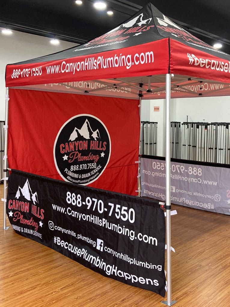Because plumbing happens everywhere, why not grow your business with a great Custom Plumbing Canopy Tent.  Going to a community event, trade show, baseball game or a job site just got a whole lot more exciting with your tent.  What a great opportunity to show off your brand and really let potential customers get to know you and even buy some swag. They will see that you care about a professional image and the details that are crucial in plumbing!  Our custom tents give you just that extra bit of real estate to list your services or even add contact information in plain sight.  Not to mention it’s a great place to have take a break during a big job in comfort and shelter from the elements.