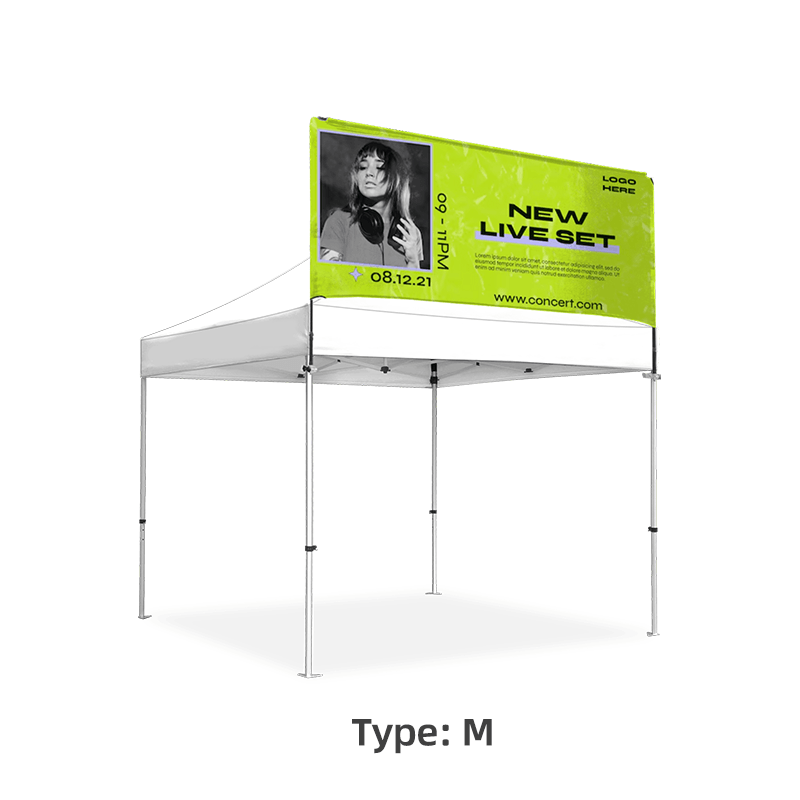 If you want to really stand out at an event, go vertical! Our custom Rectangle billboard banners attach to a frame which attaches to the corners of your 40 mm hexagonal tent frame. This can give you up to an extra 4 feet on top of your canopy to be seen. When combined with an advertising tent, these banners are perfect for festivals, farmer’s markets, outdoor concerts, craft fairs, and event sign-ups. You’re not limited to put it on the front of your canopy either. Switch it up and put this on the sides. Continue your branding and make a real impact!