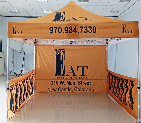 Bring your restaurant to the forefront of every mobile event with a custom restaurant branded tent.  Festivals, fairs, community events, catering jobs or whatever you’re up for will be taken to the next level with a branded tent.  Be there for those customers who say, “I’ve always wanted to try that place!”  Having a brick and mortar is the bread and butter of your business but a tent will only help grow that business!  Stand out in a sea of white tents with a bright, colorful restaurant tent to attract your customers to the best the Market has to offer.  Your customers will know right away that you care enought to give the best food and service and take care of them in comfort.  Custom 10×10 tents are a great investment for all small business owners. Branded with your logo, your contact info will be easily accesible to hundreds of people at one time.  Not to mention its a great place to have a conversation in comfort and shelter from the elements.  Plus, it’s super easy to set up and transport in our rolling carry bag.