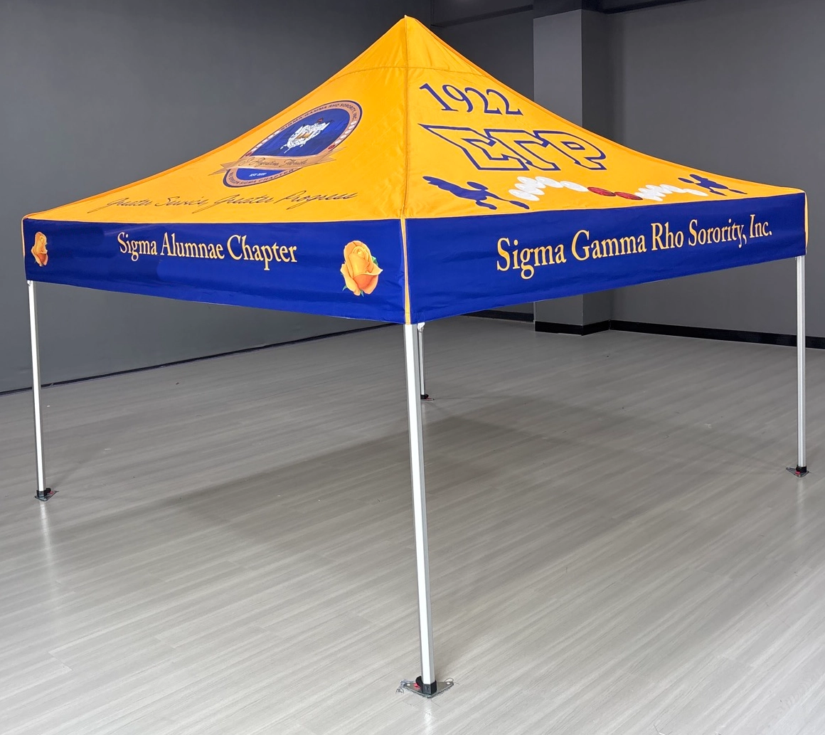 Ladies, you know you want the very best for yourselves and your Sorors!  Purchasing a custom sorority tent is the perfect way to spread the message of “Greater Service, Greater Progress”!  You deserve the best!  You don’t have to stick with the design you see here.  We can customize your design any way you would like – colors, names, logos etc. – the sky is the limit.  Going to a tailgate, recruiting new members during rushes, and promoting your organization will be so much easier with a branded custom tent.  Your sisters and brothers will really appreciate the shady place to sit during the fun.  What a great opportunity to show off your brand and really let potential members get to know you.  They will see that you care about a professional image and the details that are crucial!  Our custom tents give you just that extra bit of real estate to list your services or even add contact information in plain sight. Our tents can be easily set up and transported to various locations like the aforementioned and also corporate events or picnics, trade shows and any other event.  Not to mention it’s a great place to have a conversation in comfort and shelter from the elements.  We can also customize vinyl banners, Step and Repeats and custom table cloths for tailgates and other events.