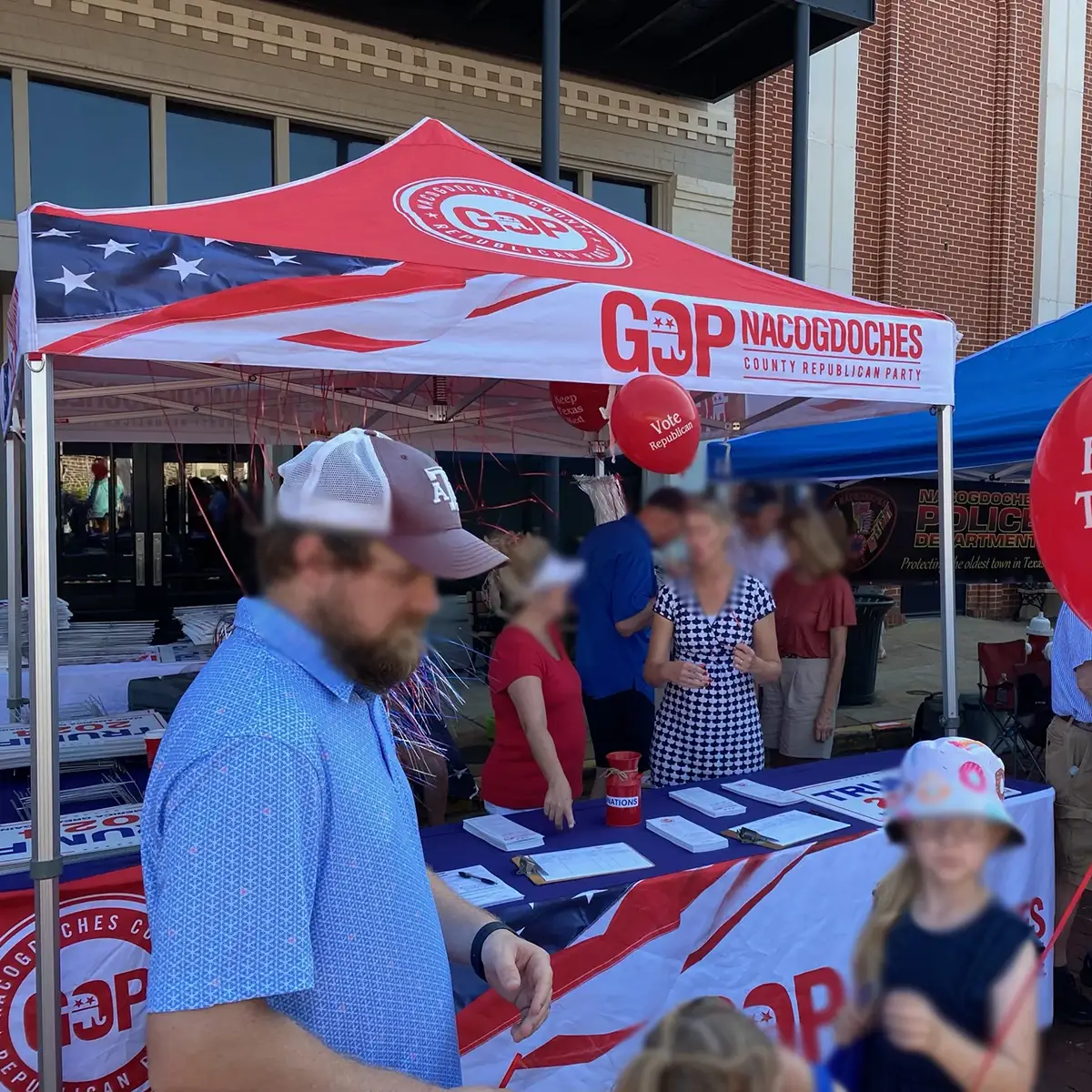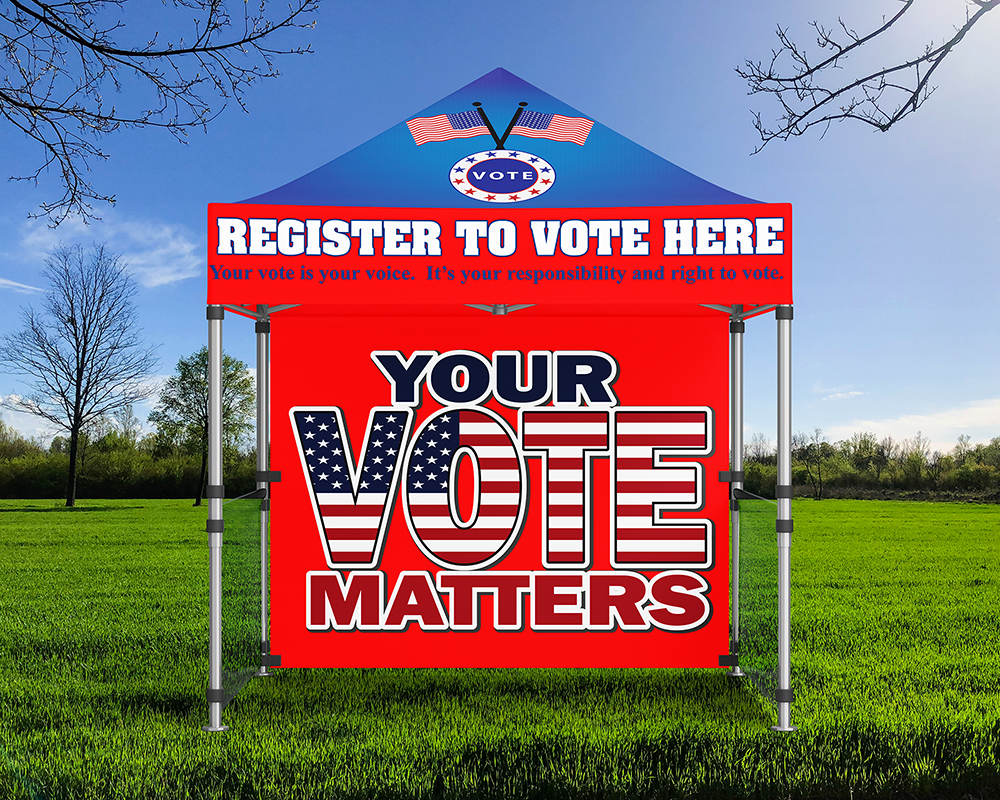 Community out reach is key to many successful organizations so why not do your work in comfort. It’s never too early to start getting ready for the political season ahead. The only way we can ensure that our voices are heard is by getting out to VOTE! The first step in doing so is to Register! Let people know you are there and ready to help them be able to do so. What a great way to use your existing custom tents if you have them. It’s also a great excuse to purchase a new set for your organization. Doesn’t really matter if you are a corporation, a political entity, a sorority or fraternity, or any other business it will just be one of many uses for a custom Pop-up Tent.