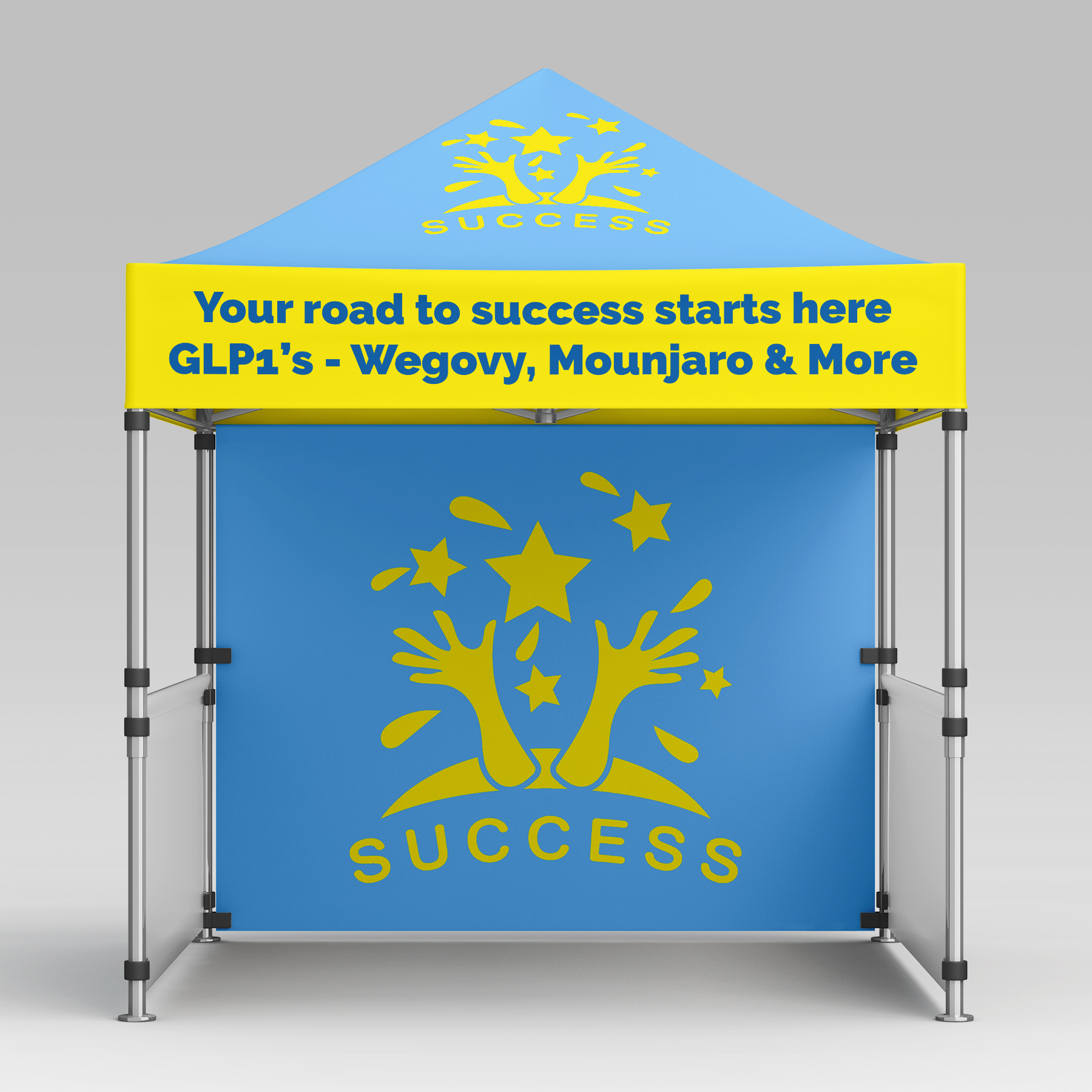 The medical and health field has finally discovered a way to help people lose weight and quiet food noise. GLP1’s – Semiglutide (Ozempic & Wegovy), Terzepatide (Zepbound & Mounjaro) – are proving to be the most effective tool in years! Health and wellness are key to a long life and this is a great place to start! There are so many places you could use a new custom pop-up tent. Your clinic or small business could use it at health fairs, fitness expos or tradeshows, wellness events in local gyms and the list goes on. What about taking your tent out to do pop-up locations like those fun outdoor bootcamps or yoga in the park? You could do assessment and provide information to your potential clients in comfort. Branded with your logo, your contact info will be easily accesible to hundreds of people at one time. Not to mention its a great place to have a conversation in comfort and shelter from the elements.