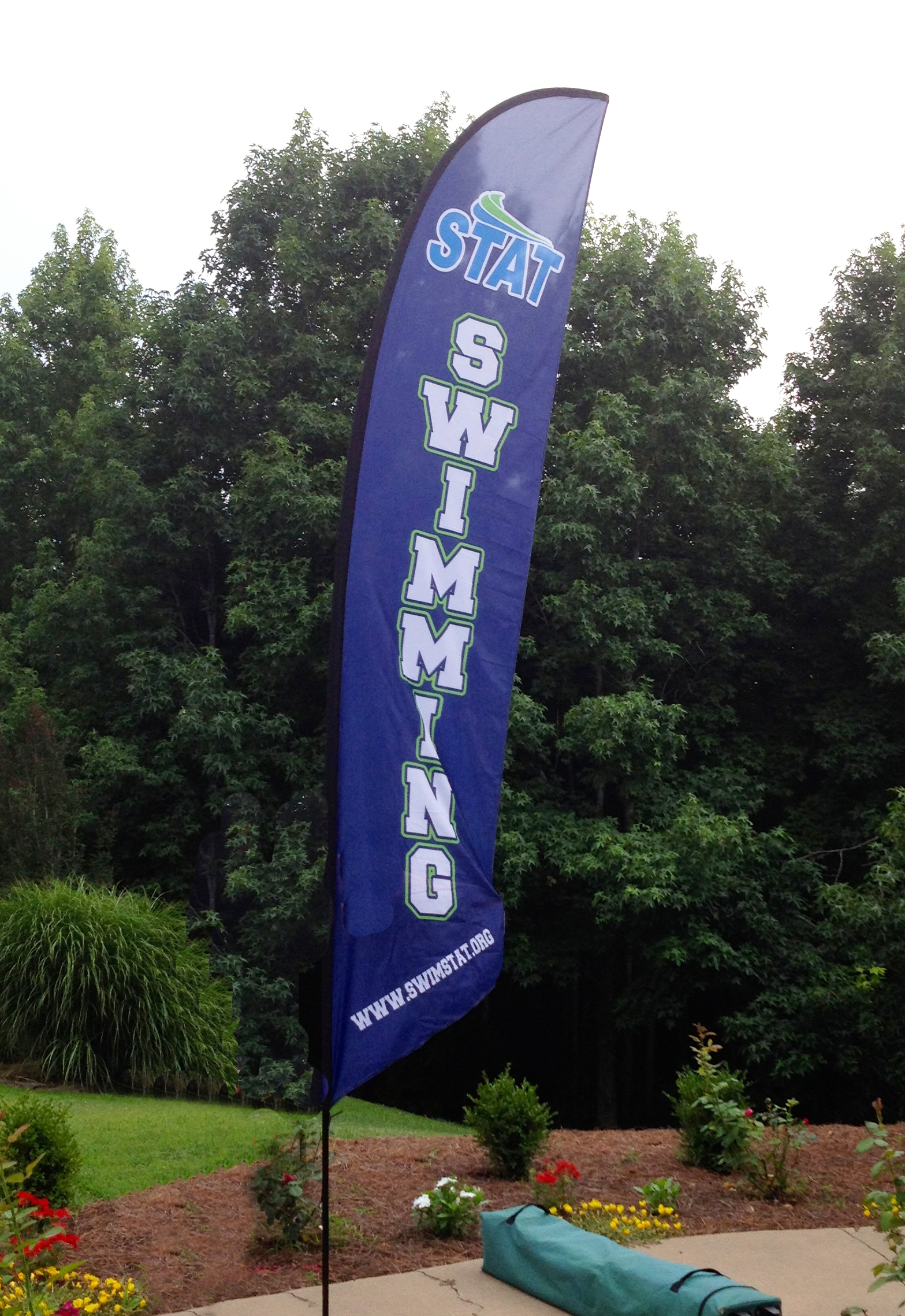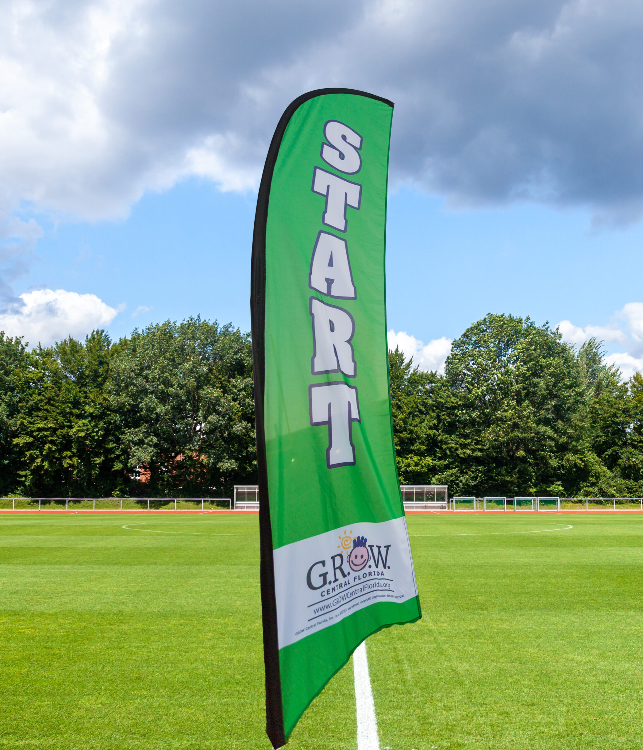 No matter the sport, we spend a lot of time invested in youth sports as parents. Youth Sports custom feather flags are the perfect way to make a real impact at an excellent price. Our custom flags offer you a chance to show off your logos, name and colors! No one on the field or in the stands will have trouble finding their people if they are gathered around a bright flag with your team’s logo or name. We are sure your players will be proud to meet by “their flag”. Branded with your logo, your contact info will be easily accesible to hundreds of people at one time. When it comes to size, we offer options to suit a range of occasions and locations. Each size is a viable choice for any location either inside or out. From the “small” 9ft size for indoor events – think hockey or indoor football or soccer, to the balanced visibility of the 10.5ft medium size and the commanding attention of the 14ft large size in expansive outdoor spaces like football or soccer fields. Perfect for Youth Football or Cheer teams, Lacrosse, Soccer or Baseball and they are great in any weather for all the seasons those sports cover! There are no wrong choices. Let’s be honest, the 9 foot “small” flag is still really tall!