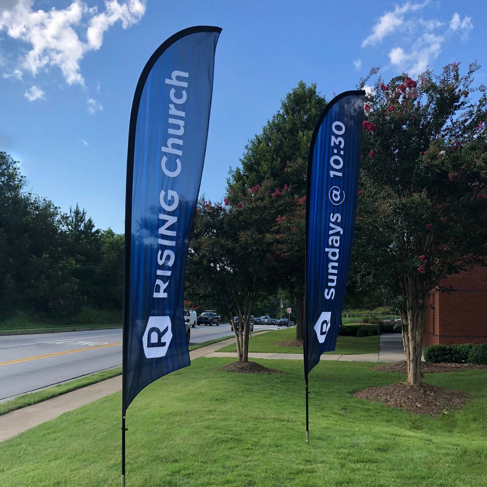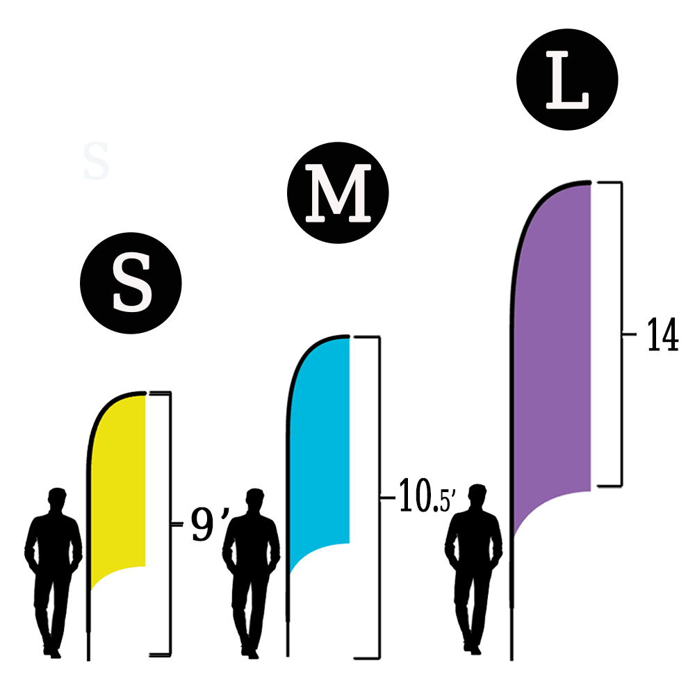 Our flags come standard as single sided print through which 99% of our customers choose. Very easy to maintain. Same as the front side, only reversed. When it comes to size, feather flags offer options to suit diverse requirements. From the compact, yet impactful, 9ft size for indoor events to the balanced visibility of the 10.5ft medium size for outdoor use, and the commanding attention of the 14ft large size in expansive outdoor spaces – choose the dimensions that align with your brand’s presence.