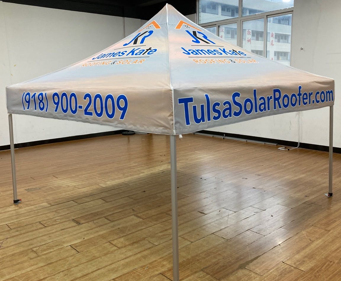 Make a bold statement with actual photos of your business in action, place on your backdrop.  Photo backdrop tents are a great investment for any business, small or large.  It gives your customers a chance to see and get a feel for your work, maybe even sit down under shelter and go over ideas.  It also helps them invision what their product or job can actually look like.  They can be easily set up and transported to various locations, such as open houses, community events, or trade shows.  Branded with your logo, your contact info will be easily accesible to hundreds of people at one time.  Not to mention its a great place to have a conversation in comfort and shelter from the elements.